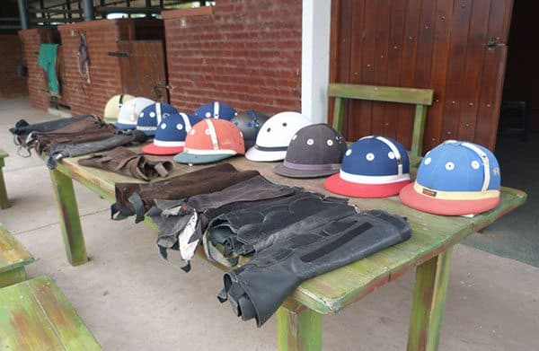 Our ponies have been trotted over and our gear is laid out on the ground. This includes a helmet, chaps to be strapped around the calves, a whip (which was merely a prop I think) and the mallet.