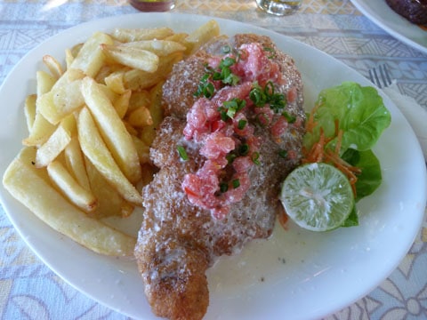 I ordered the mahi mahi pane au lait de coco avec frites. In other words, breaded mahi mahi with coconut milk and fries. I could have (and probably should have for health reasons) had the rice. Cost CFP 1600 (NZ$21) It was sensational with a tomato salsa on top and a half lime for squeezing. Even though it was lunch, this has seen me right and I don’t need anything more than a couple of red wines for dinner!