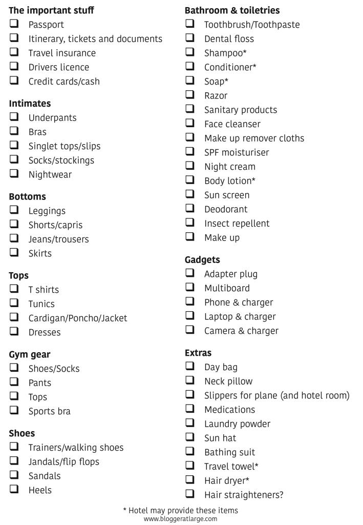 So I’ve written this travel items list for you to print off and add the quantities of what you’ll take in the little boxes, cross off the things you don’t need, then when it comes to actually packing your bag you can run down the list and simply tick them off.