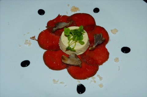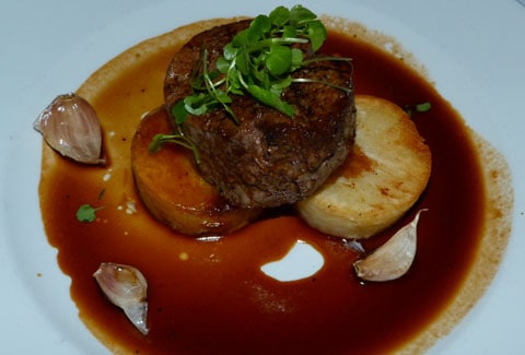 This was also my dish: lamb with a feta and sundried tomato crust, aubergine croquettes & caramelised sweetbreads (which I gave away!)