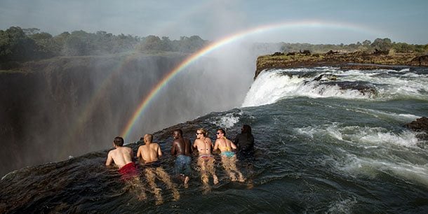 In Livingstone, Zambia you can go out to Livingstone Island in the dry season (July to March) on the edge of the Zambezi River and when the mighty Victoria Falls (twice the height of Niagara at 110m) dwindle you can jump off the edge of the roaring falls of mist into this jacuzzi called the Devil’s Pool in the very dry months (usually late August to January).