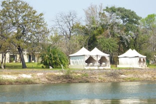 The river bank has large jagged boulders embedded in the grass to keep the soft footed hippopotamus and elephant from deciding to call in.