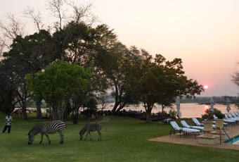 The Royal Livingstone Hotel sits in the 46-hectare Mosi-oa-Tunya national park, about a kilometre upstream from the Victoria Falls, where zebra wander onto the front lawn beside the swimming pool to graze at dusk and skitters giraffe walk elegantly through the bush.