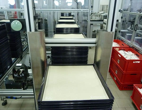 One thousand trays an hour chug along this 23-metre conveyor belt getting loaded with bowls and cups (which an “arm” sucks up to put in place) and cutlery before being loaded into the cart. And if the cutlery packet is picked up upside down, this clever machine knows that and flips it over so the Cathay branded wipe is facing up. Cool ay?