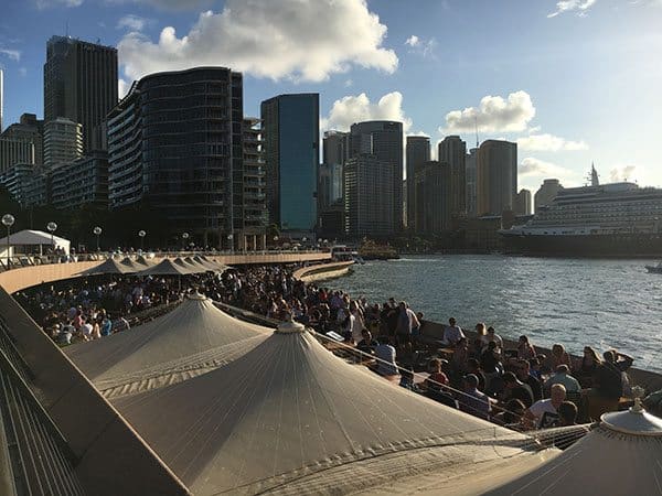 The name is a little misleading though as it’s more than a bar and is not actually in the Sydney Opera House. Instead it’s down the steps along the waterfront below the mighty angular caps of the tiled House. It sprawls along with tables and chairs and a few umbrellas for the lucky ones who get there first.