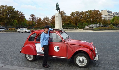 We pull over this time and climb out to pose in front of our little chariot with the scenes of Paris in the background.