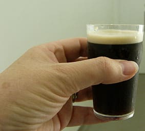 - When the beer has settled and turned black, take the glass and top it off by pushing the tap away from you this time so you don’t get any more gas. Never put the tap into the foam, and do not let the precious nectar overflow, but fill it so the head rises just above the rim.