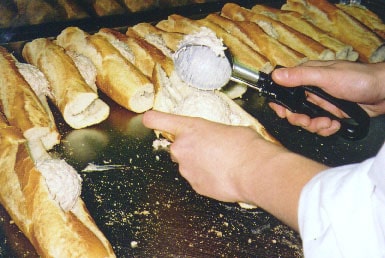 We cut French sticks to regulation size, as measured on our recipe card, and I dolloped a scoop of tuna/mayo into the middle which she deftly spread with a fork. My next job was to put five pieces of perfect cucumber slices into each one. By perfect, she meant the skin must join all the way round otherwise it gets tossed aside.