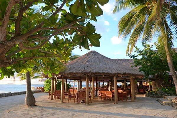 Upstairs at the Sundowner Bar the cocktail list looks like just the thing to top off our grand arrival, as we fill out the required registrations forms then are led to our rooms. Mine is #13, a beachfront bure with a high ceiling covered in tapa cloth under traditional thatched roofing with a modern bathroom and big comfy bed covered in crisp white linen. A large bowl of water has been placed on my veranda so I can rinse the sand off my feet and wipe them on the bathmat that has been handily placed inside the door.