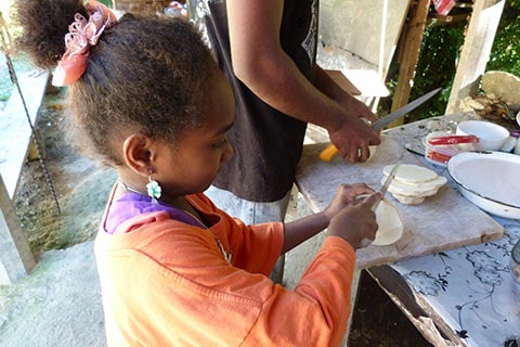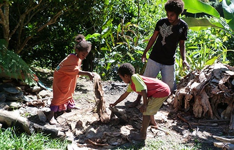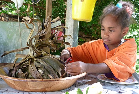 Then dad piles the chicken, onions, taro, ignames and seasoning onto banana leaves softened quickly over a fire…