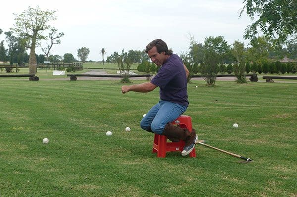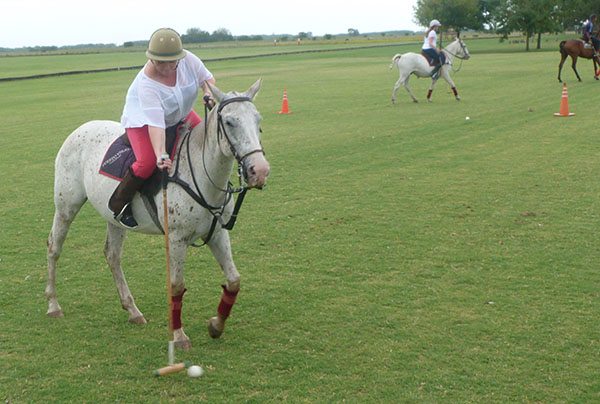 Julio throws some of the plastic balls into the field and we practice our coordination. Reins and whip in the left hand, held in the centre above the mane, and mallet in the right.