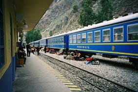 After a couple of days in Cusco you can start hiking the 4-day Inca Trail or take the train. I took the train. We left at 9am and rocked and rolled for an hour and a half from Ollyantaytambo, (the train had started in Cusco). It was the 4th that morning to Aguas Calientes, the town at the bottom of the mountain where hotels and markets thrive. Hotel porters met us and relieved us of our luggage right there on the tracks and we immediately boarded buses for the scary ride up the mountain road (several times having to back up 50m to let oncoming buses down).