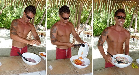 A barbecue is sizzling away to feed everyone and a team of shirtless Tahitian guys will bring the food to you while Amo made fresh poisson cru for us. This raw fish salad is a spin on the South American cerviche and here’s how he makes it: