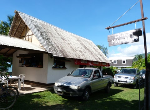 Total bill CFP 4780 (NZ$65) for 2 large Hinano’s, 1 coke and the 2 meals. Snack Mahana is located about 2km east of the Intercontinental Resort, next to Woody’s Pearls. You can use the resort bikes if you don’t have a car.