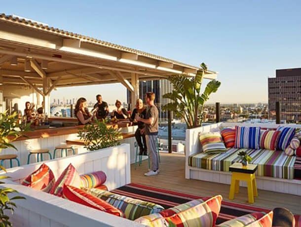 But the piece de resistance, and the reason people come whether they’re checking in or not, is the amazing LA rooftop bar. By day it is a yoga space with classes and downward dogs punctuating the 360 degree views. By night it is a bustling bar with comfy couches and huge day beds separated by potted plants and groovy lighting and music keeping pace while a movie screens in a small nook for those who fancy settling in.