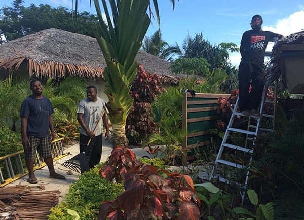 The former managers at the property had weathered more than a dozen cyclones in their hotel management career and consequently took a lot of preparatory action, pruning and chopping trees down and the huge nakamal roof over the main atrium/dining area survived the storm thanks to the genius idea of bolting it down.