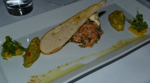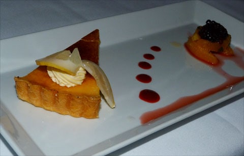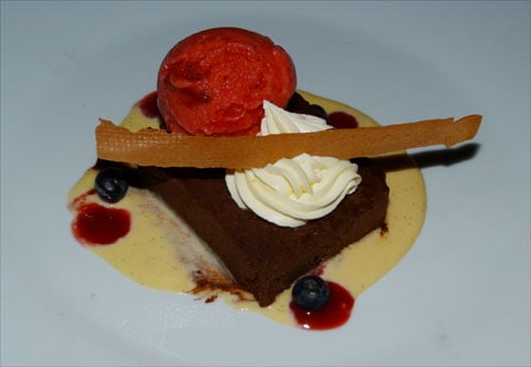 This was also my dish: lamb with a feta and sundried tomato crust, aubergine croquettes & caramelised sweetbreads (which I gave away!)