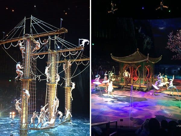 He designed the world’s largest water show with a moveable stage that comes and goes as quick as a flash and dancers become swimmers with tall ships and hanging human chandaliers. It’s a fabulous show and well worth sitting within splashing distance.