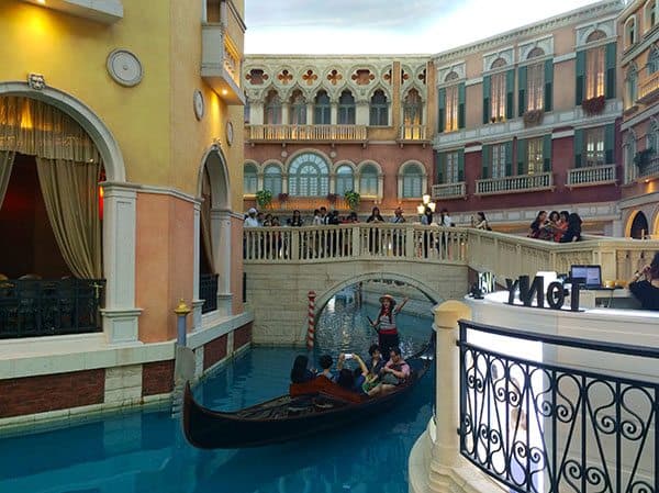 Yes the same as the Venetian in Las Vegas, except bigger! The Macau Venetian hotel has water canals winding through “streets” lined with shops – all under a ceiling painted blue with puffs of white clouds.