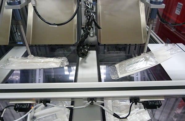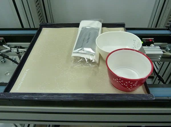 One thousand trays an hour chug along this 23-metre conveyor belt getting loaded with bowls and cups (which an “arm” sucks up to put in place) and cutlery before being loaded into the cart. And if the cutlery packet is picked up upside down, this clever machine knows that and flips it over so the Cathay branded wipe is facing up. Cool ay?